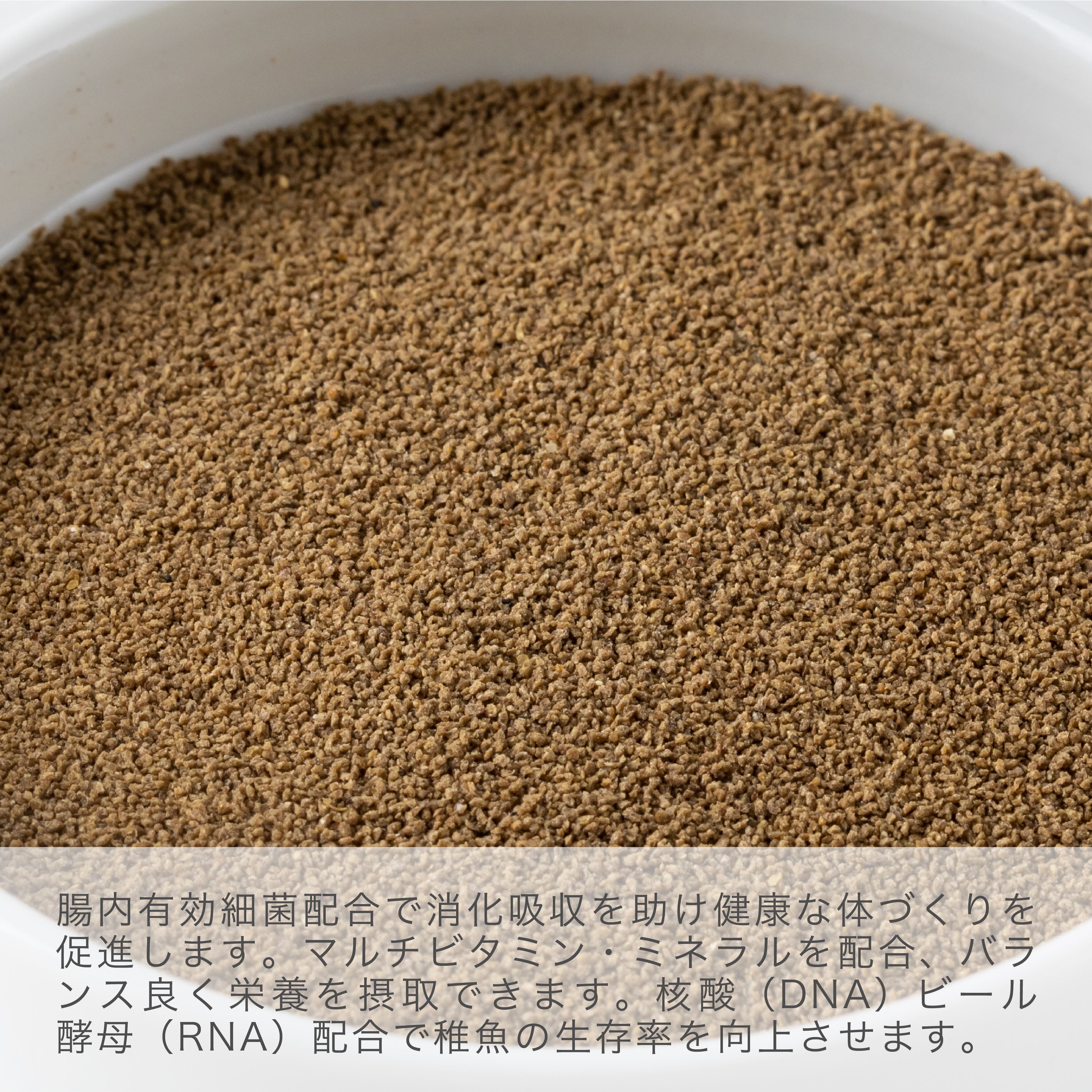 腸内有効細菌配合で消化吸収を助け健康な体づくりを促進します。マルチビタミン・ミネラルを配合、バランス良く栄養を摂取できます。核酸(DNA)ビール酵母(RNA)配合で稚魚の生存率を向上させます。