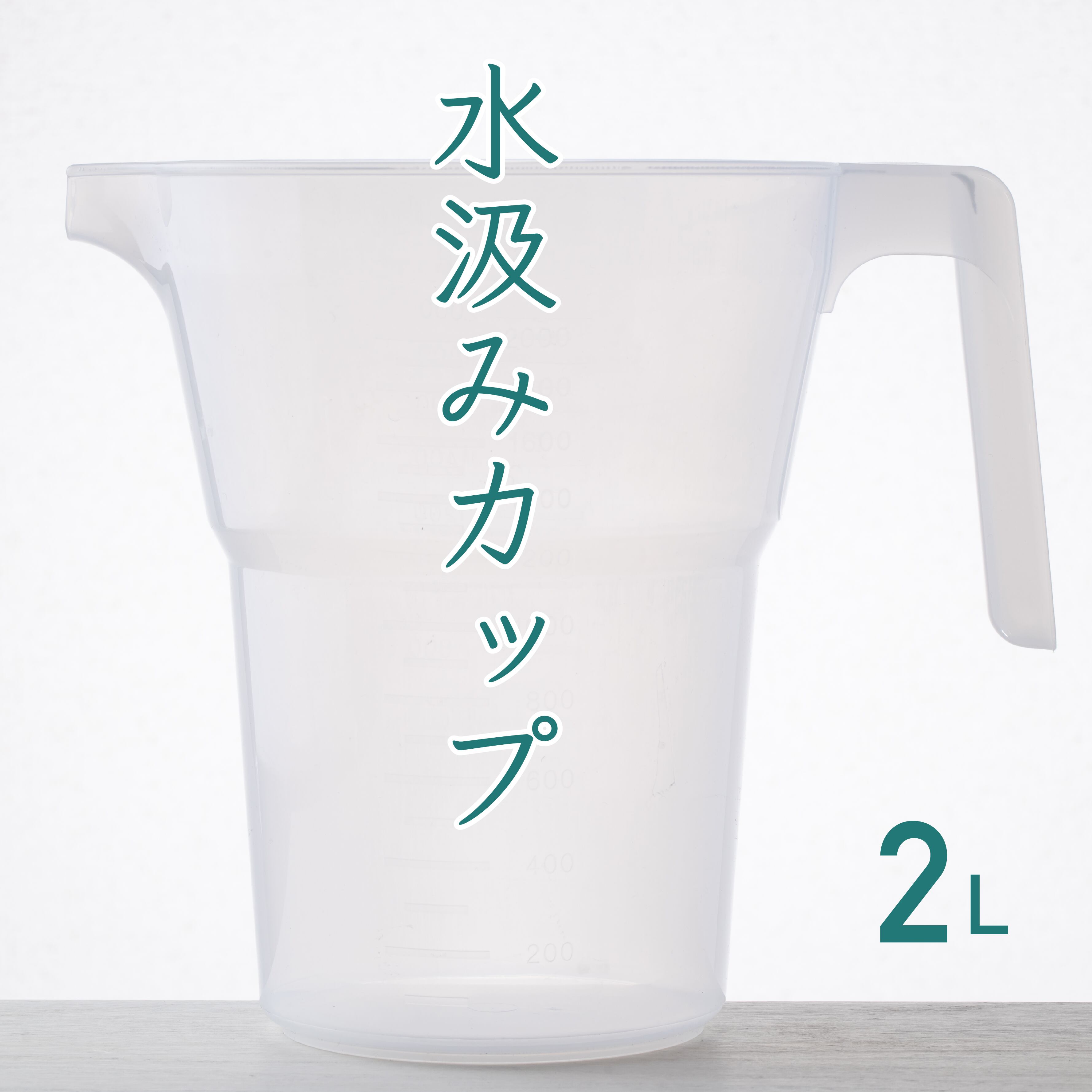小型グラスの水換えや水足しに便利な水汲みカップです。取っ手がついて持ちやすく運びやすく、2Lとちょうどいいサイズ。